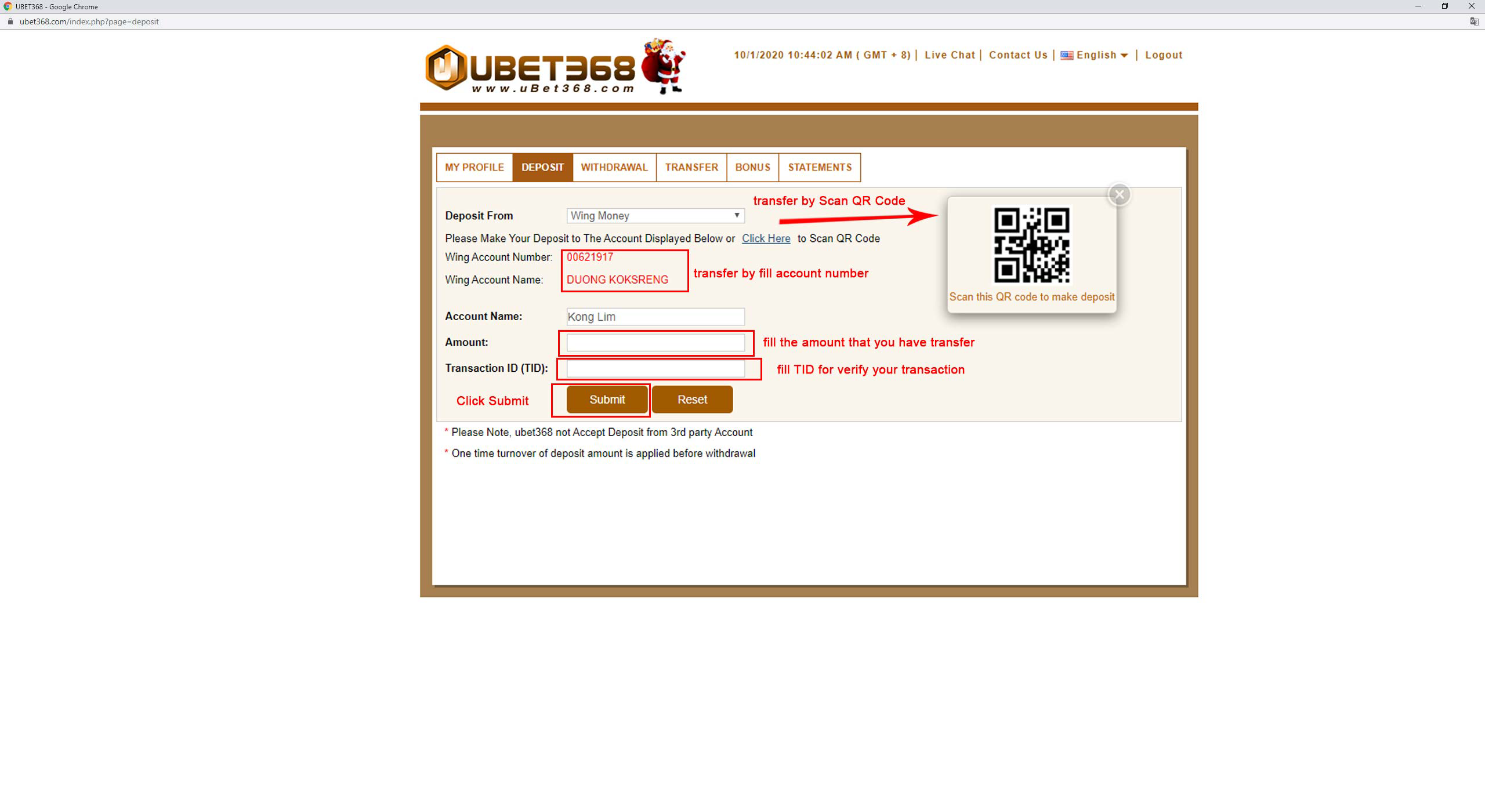 6.Click Submit and wait for 1minute you will received fund into you uBet368 account after company verify your submit information it matched with your transfer detail.